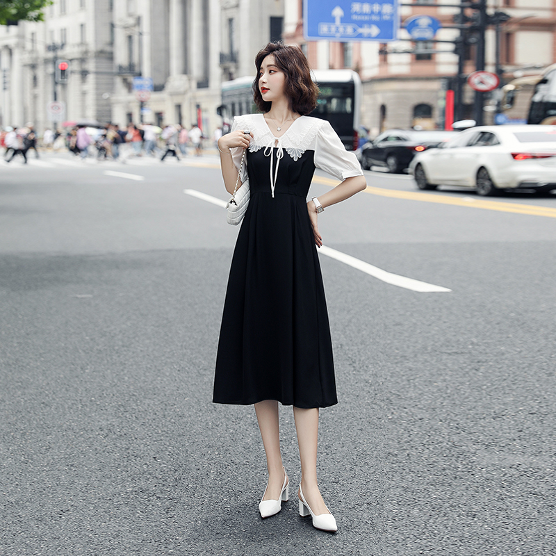睦火火 娃娃领连衣裙夏新款女2021设计感小众小个子黑色法式裙热门设计联盟服务商