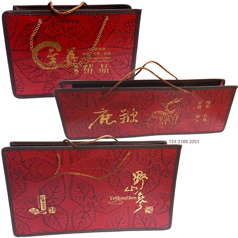 以下是野山参专用仿皮礼品袋的实货实拍,共有小、中、大三种规格: